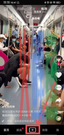 打开抖音短视频APP之后,点击页面下方的“+”按钮。