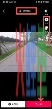剪辑完成之后,可以在这个页面为自己剪辑过后的视频加上字幕,方便观看视频的用户更好的理解视频内容;还可以给视频加上一些自己比较喜欢的贴纸,让视频的风格显得可爱一些;除此之外,也可以给视频加上一些比较简单的特效,增强视频的观赏感。在页面上方的正中间的位置还可以选择视频的背景音乐,增加视频的节奏感。以上操作都完成之后,直接单击页面右下角的“下一步”红色按钮。