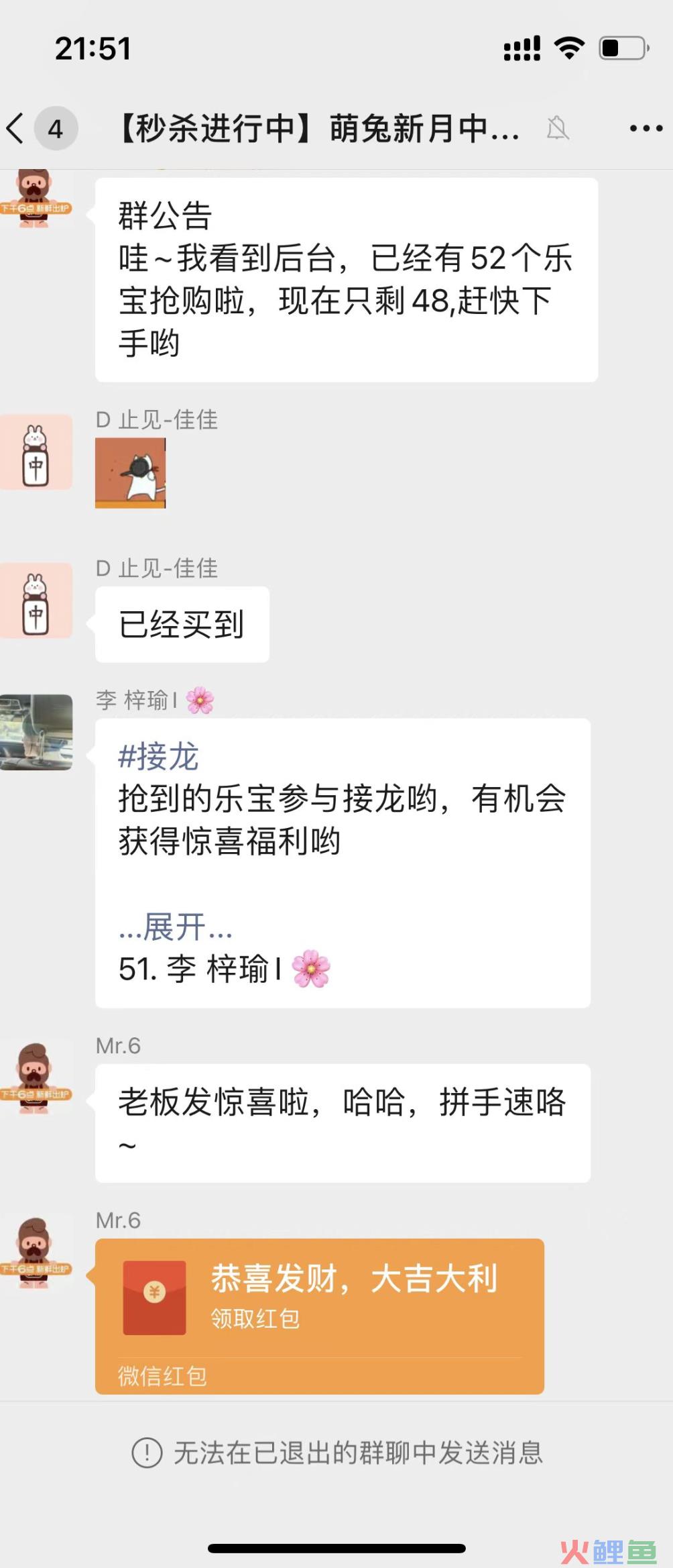 快闪群,即超短时间的团购秒杀群。以小时为单位,在社群内通过短期的优惠刺激,利用人们的从众心理、稀缺效应以及紧迫感,达到快速出单,批量成交的目的。