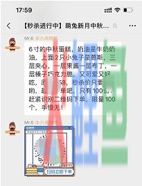 因此,我们计划进行为期1天半的快闪群秒杀活动,限时、限量,大折扣、大福利,快节奏、快提升的去策划本次的中秋秒杀活动。