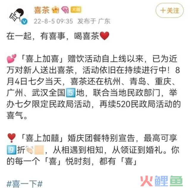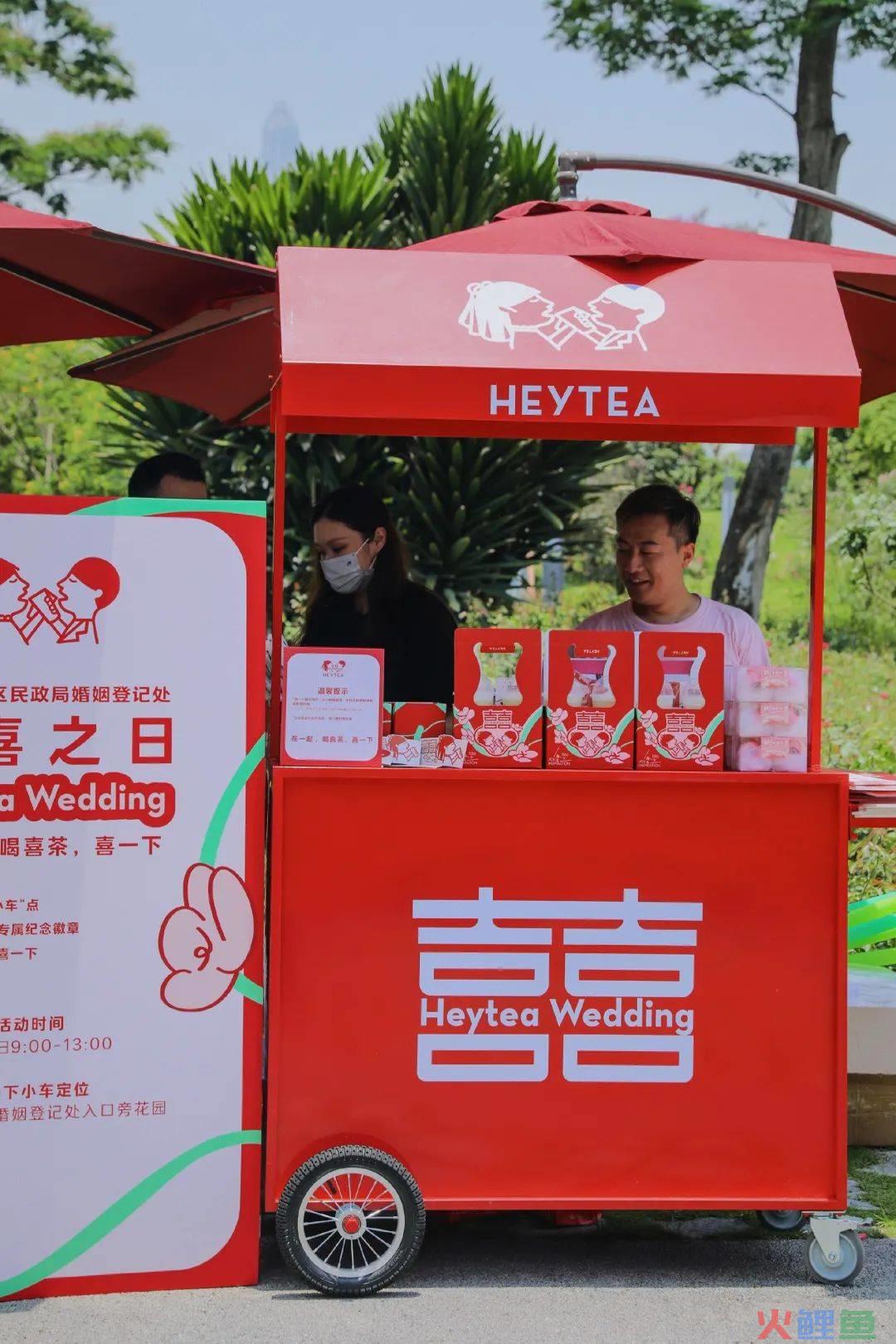比如,520的时候,喜茶变囍茶。还去各个民政局快闪,给刚领证的情侣们,送上囍茶。