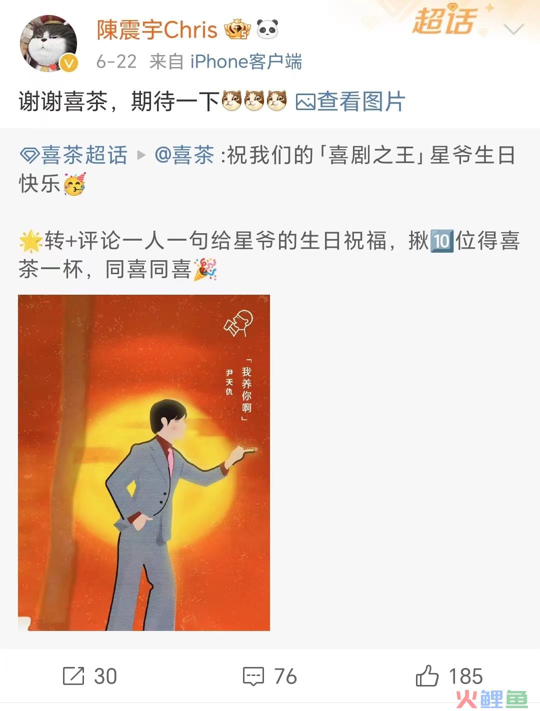 随后,星爷的经纪人陈震宇Chris转发微博并对喜茶表示感谢,同时贴上一张“内容满满”的照片。