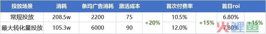 最后,我们拉取了那一周的常规投放和最大转化量投放的广告的数据进行对比,最后的结果也挺令我们惊喜的。