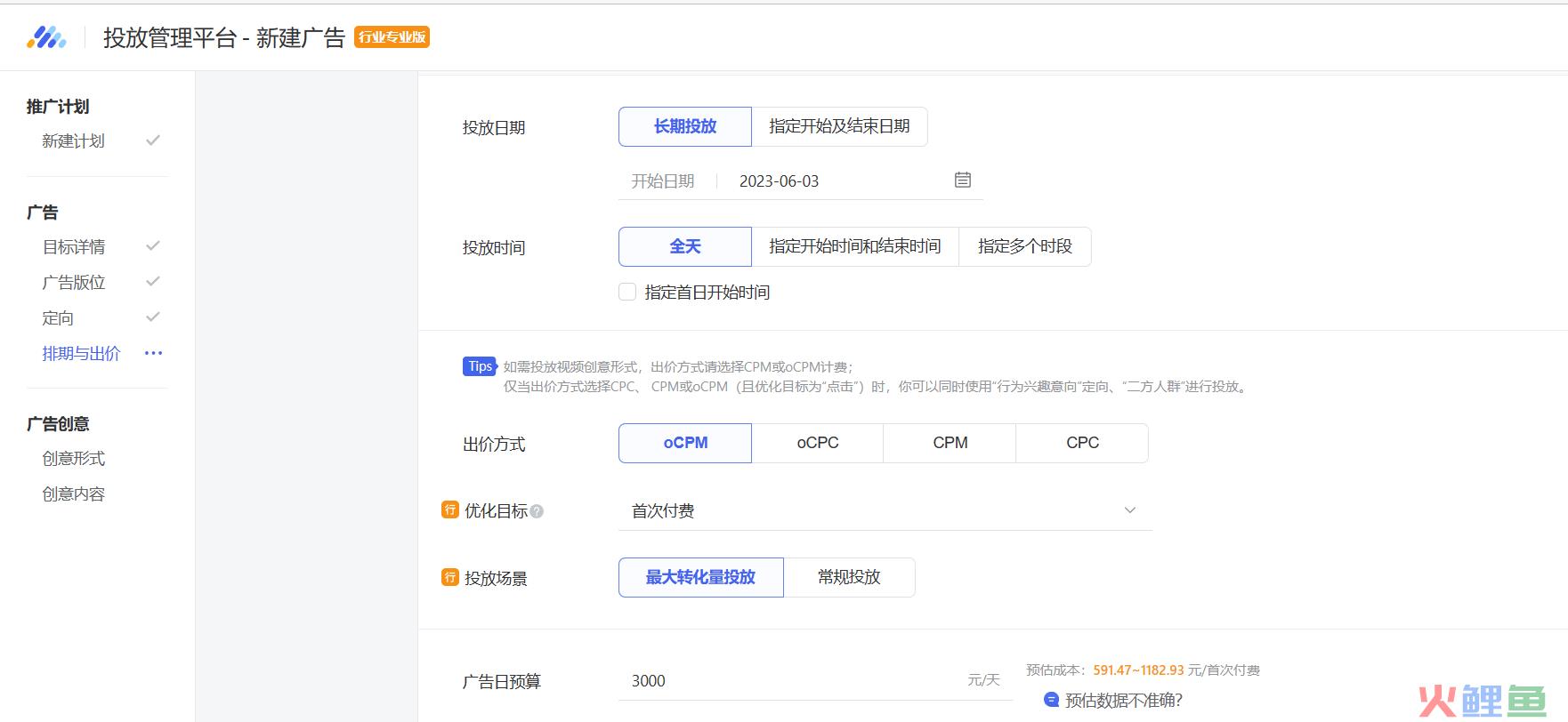 总的来说,预算不建议设置过低,比如低于1个首次付费成本或1000元,可能会导致系统探索不足产生空耗。 同时,广告计划预算建议设置为不限,主要通过广告预算调控即可。