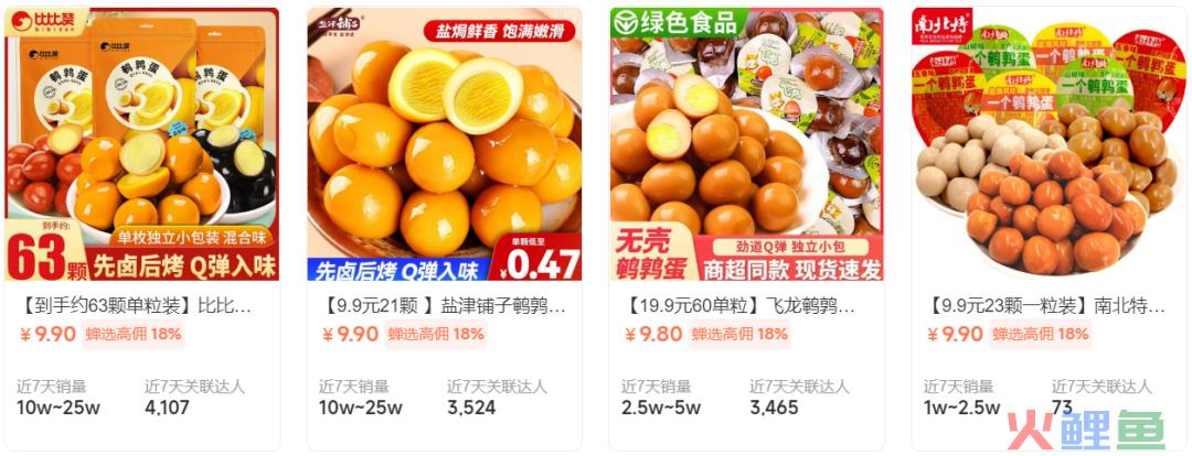 不难看出,相对于9.6元32g的卤味鸭舌,9.9元63颗鹌鹑蛋“便宜”得更加直观、具体,就算是其他品牌的同类商品,比比赞也能有足够的优势,差不多的价格,翻倍的量,谁看谁不迷糊?