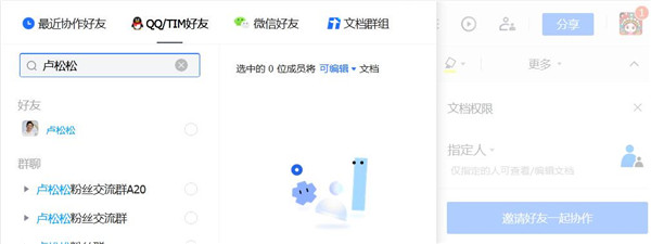 第二步:点击编辑好的文档,然后点击文档右上方的文档权限,再然后点击邀请好友一起协作,批量选择好友发送。