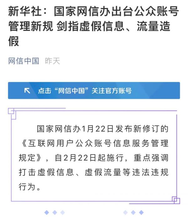 1月22日,国家网信办发布新修订的《互联网用户公众账号信息服务管理规定》,自2月22日起施行。本次新规共有五章二十三条,分别对平台、运营者及监督管理等三方进行了规范说明。