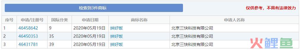 通过商标查询可发现,北京三快科技有限公司在今年5月19日就提交了3件“拼好饭”商标注册申请,商标注册类别为第9类、第35类以及第36类,目前这些商标都出于等待实质审查阶段。