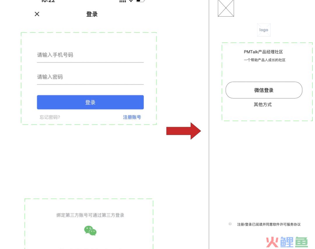 但手机号、验证码的方式和微信登录成了并行选项,相对于一个页面提供了用户两种注册入口,可我们更希望用户不用做选择,专注在注册流程里,所以改为右边交互版本