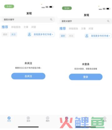 两者都建立用户在游客模式下,可以点击关注/推荐栏目进入到登录注册页面,因为需要用户注册才能使用这部分功能。如下图是我们app的游客模式