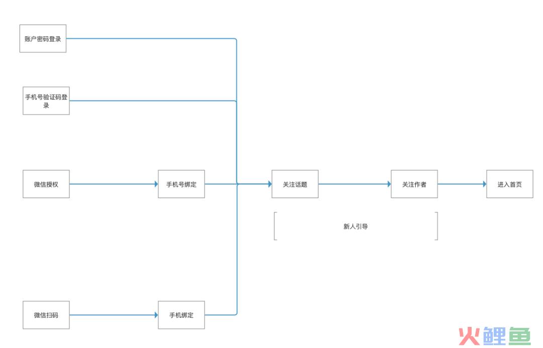 是微信授权-手机号绑定-关注话题-关注作者-进入首页
