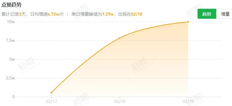 截止目前,当期视频转赞数均超过10万,其中点赞的单日增量峰值为7.29w,3天内日均增速4.72w。