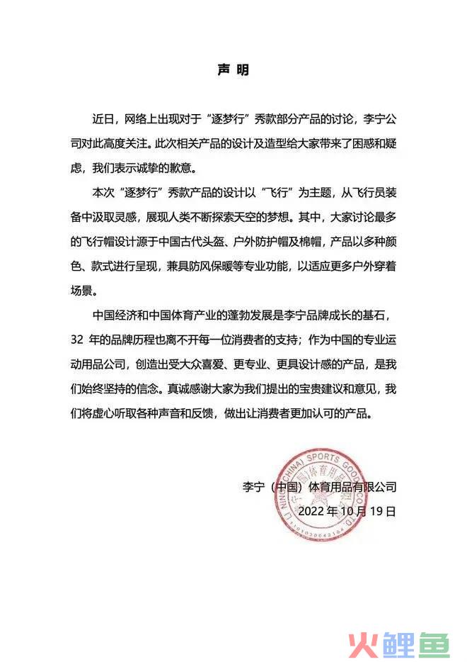 尽管在10月19日李宁官微发布声明,就走秀款引发的误会进行道歉。