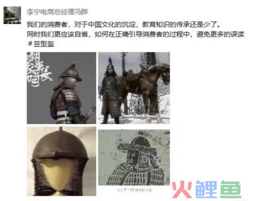 李宁电商总经理冯晔传递出的信息是,我们的设计是源于中国古代头盔的元素设计,中国古代的军帽就是这样啊,你们误解是你们受教育不多。