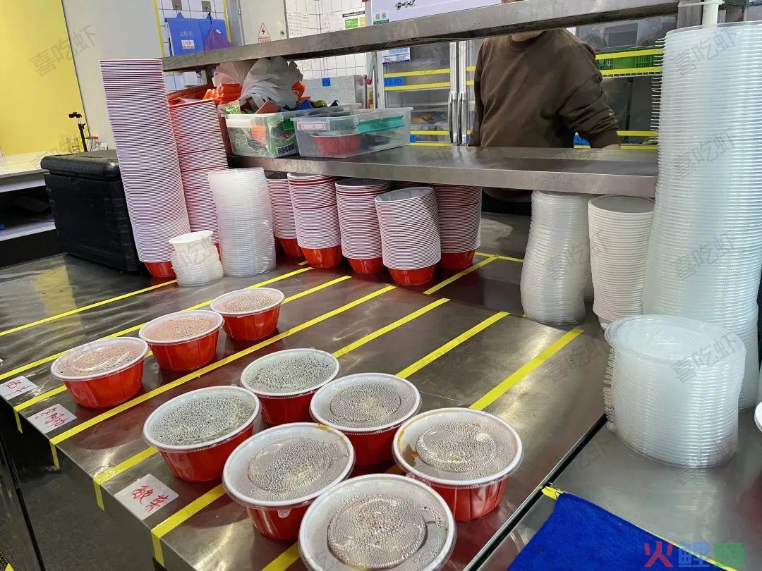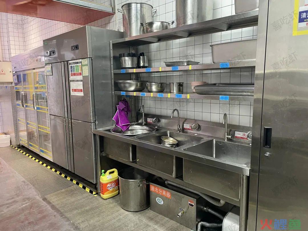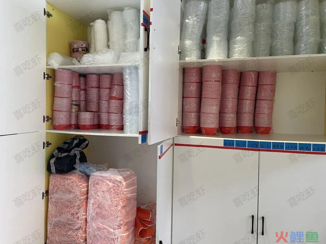 喜吃虾所有门店都采用开放式厨房,整个厨房的分区也是经过精心设计的;设置专门的储物柜对所有物品进行分类,打包盒、底料、清扫工具等,动线细节处理和冰箱分区处理做得也很到位。