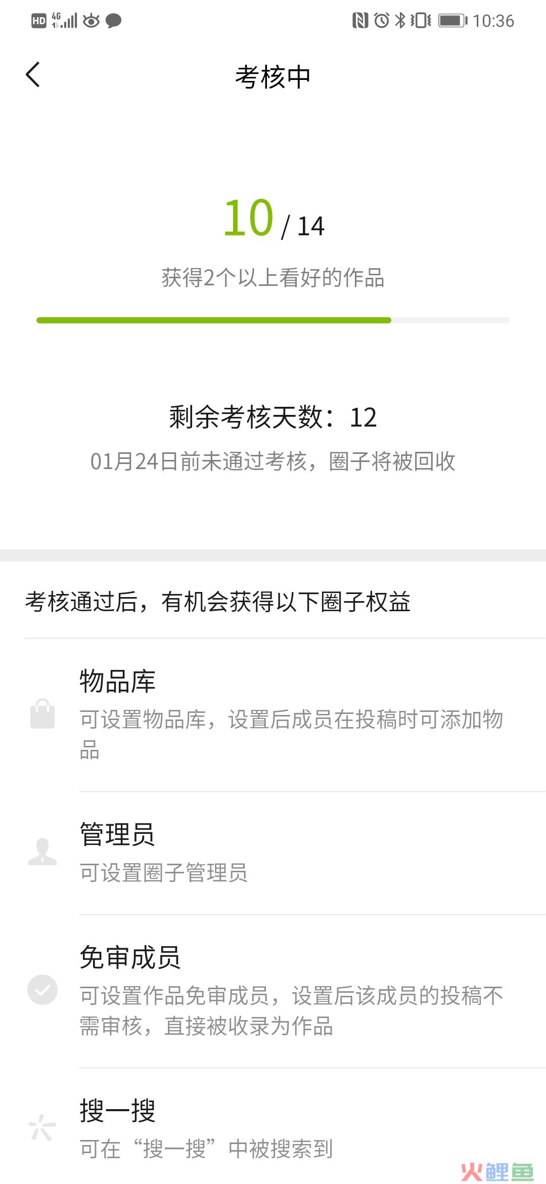 每天有2个人点看好自己的作品,则得1分,14天那14分,即可通过考核期,若未通过,则被官方认定为不活跃的圈子。则会被收回。