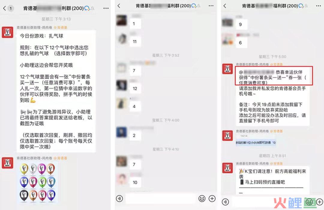 比如肯德基的扎气球,运营人员在群里设置了十二个气球(虚拟),并告知消费者当中只有一个含有奖励,奖励是买一送一的中份薯条奖励。参与方式是大家随机报数字,一人报一次。报完后,运营人员再公布答案。