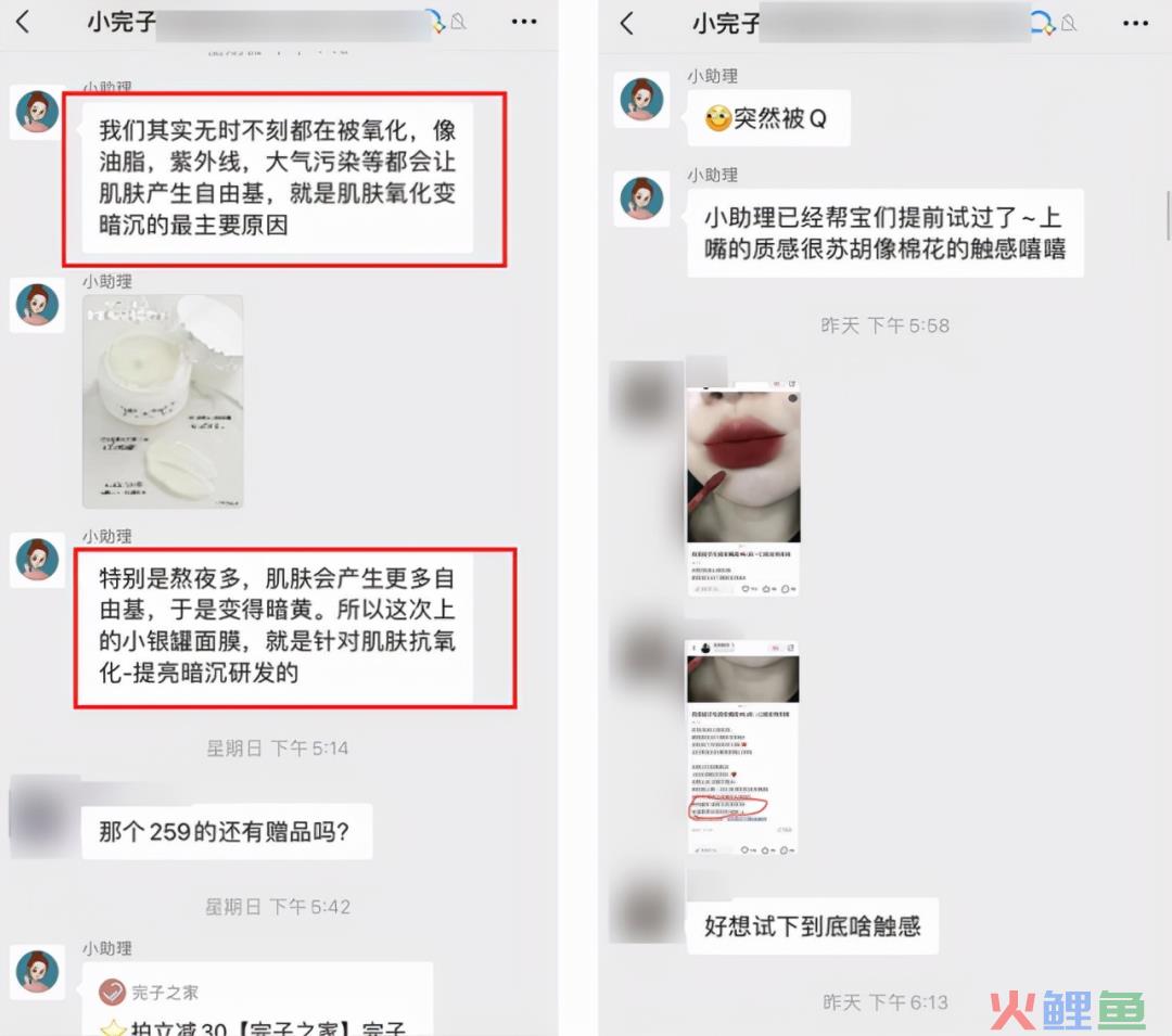 以完美日记的社区运营为例。群主@小丸子负责用户承接,把用户导入群中,再@用户发些问候语等关怀的话术,拉进彼此的距离,让用户更愿意互动。群管理员@小助手,则负责日常用户答疑、知识分享、辅助用户购买解决决策。