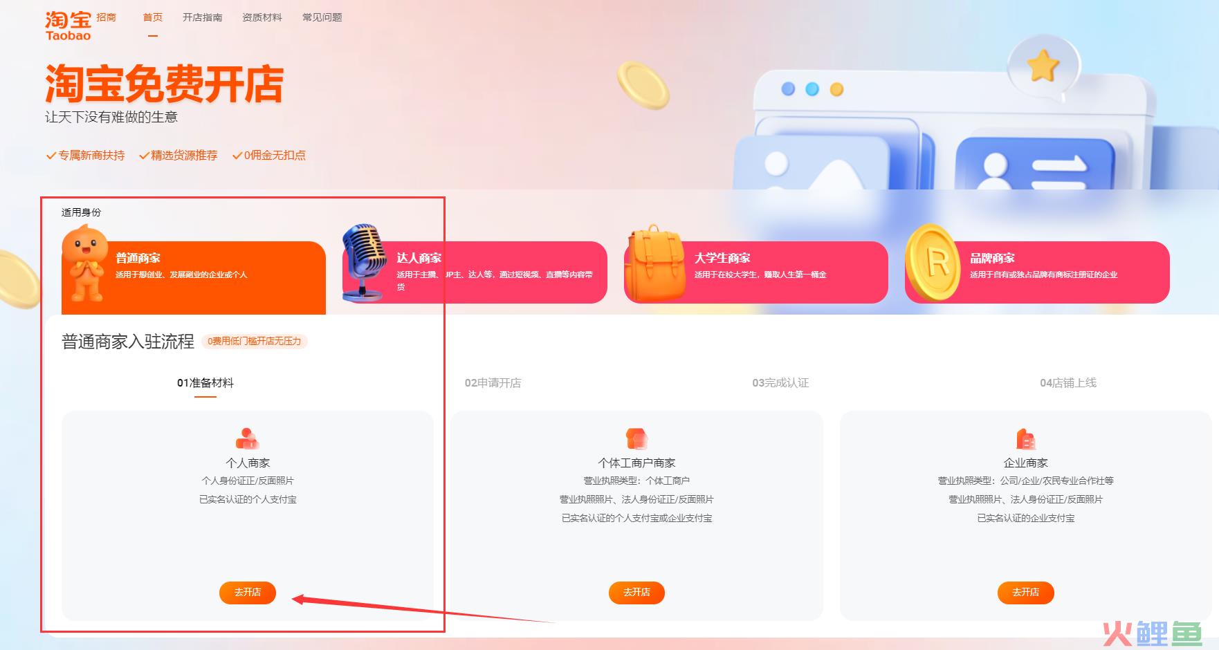 2、进入之后,准备好商家入驻资料,包括个人身份证正反面照片以及已经实名的个人支付宝,点击“去开店”,如下图所示: