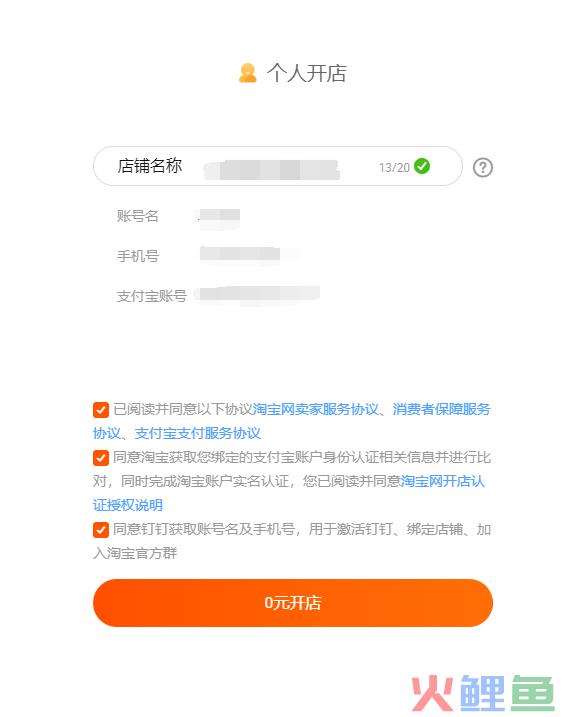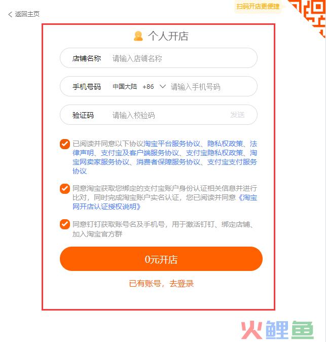 3、根据提示,填写店铺的名称和手机号码以及验证码,阅读相关协议,接着给相关协议打上“√”即可,继续点击“0元开店”如下图所示;