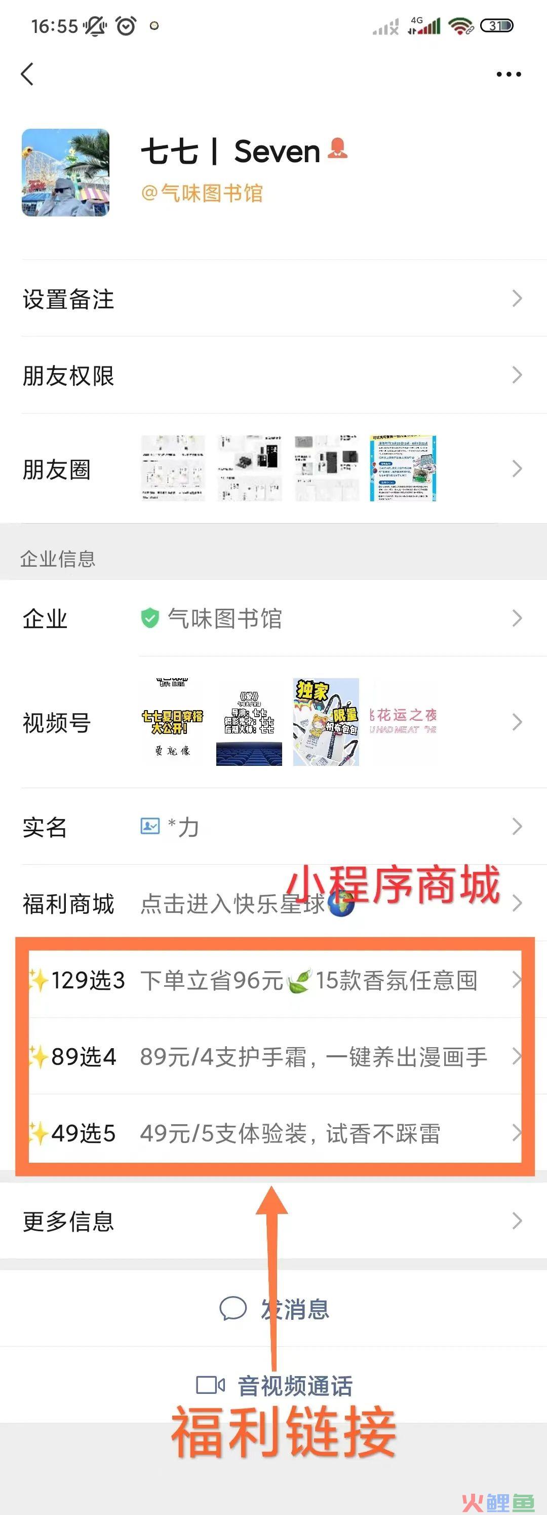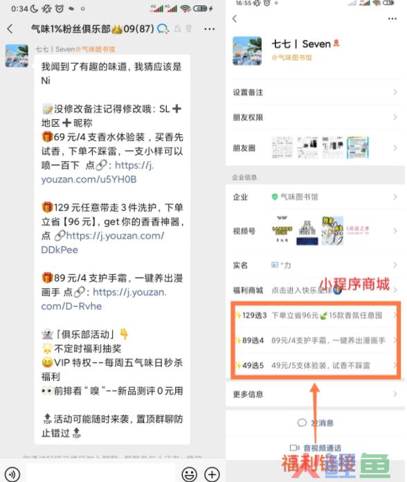 包含了视频号、小程序链接及福利链接,对于未购买过该品牌的用户来说,这里能够吸引他们点击进去,容易促成首单转化。也容易让用户和七七产生链接,比如,某个客户看到49元试香很感兴趣,就会顺势询问这个东西,能够促成后续转化。