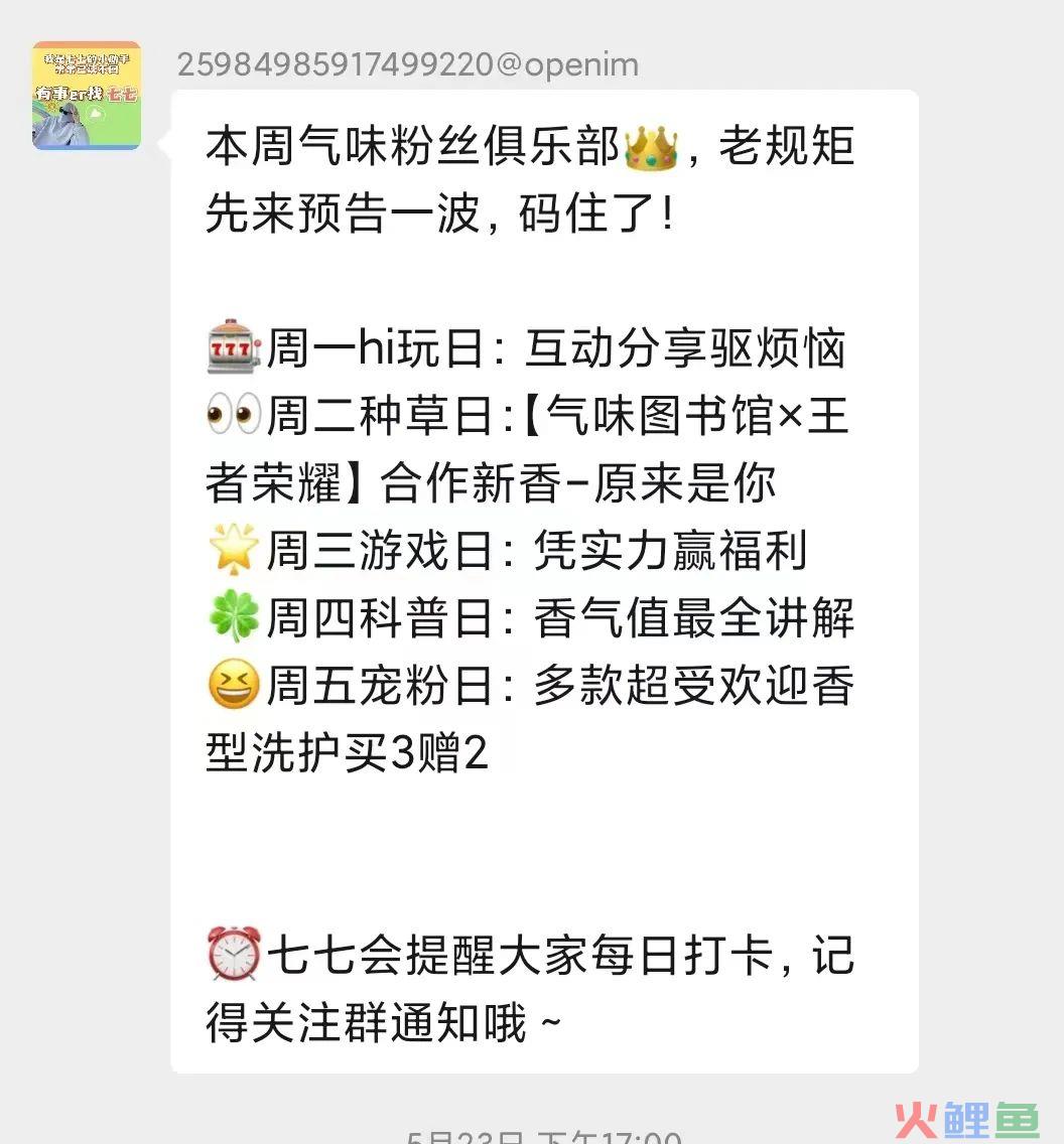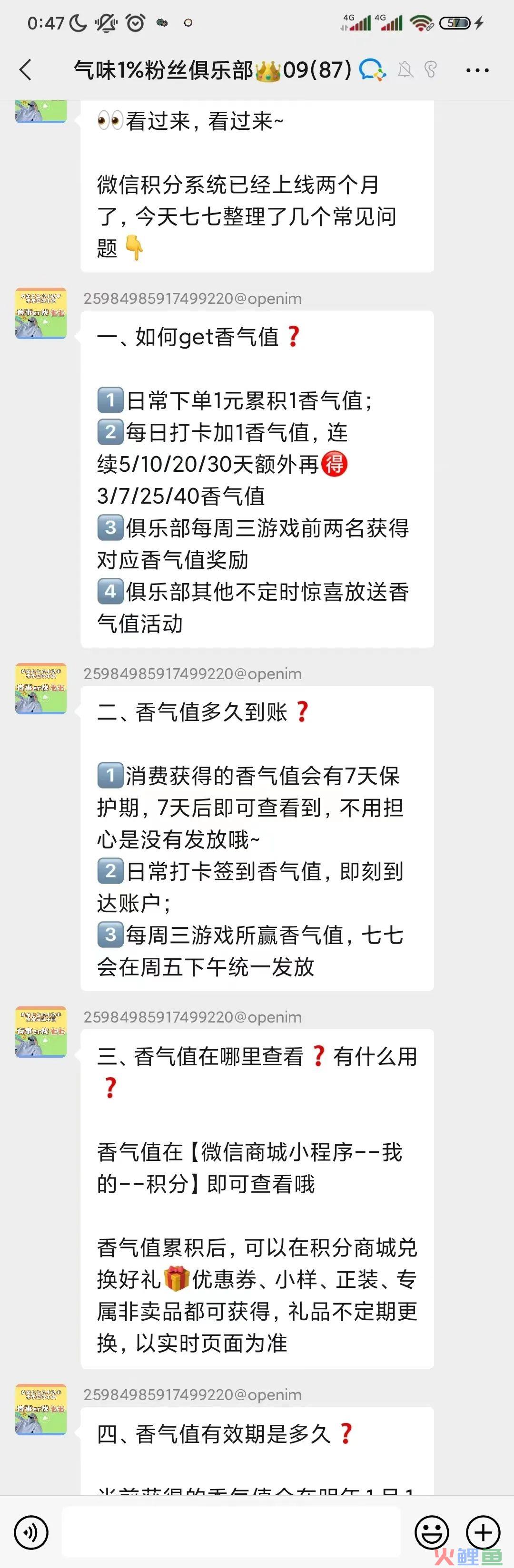 这次遇到的是关于积分(香气值)的科普。通过在社群内进行积分科普,让大家知道积分怎么来,怎么用,想要积分的人就会积极的参加社群内的活动,只要有几个人带头参加之后,其他人也会跟随参加的,就能活跃社群的气氛。