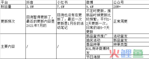 这两是重点没有任何问题,但是小红书和抖音不知道出于什么原因没有继续运营,其实作为香水品牌,不论是从它的目标客户来看,还是就目前的自媒体矩阵来看,小红书都应该是一个重要的阵地。