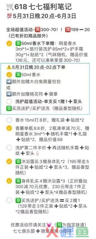 社群内也同步做了618的攻略,起到反复提醒用户的作用,同时也能吸引大家关注社群,对没有关注七七的人也比较友好。