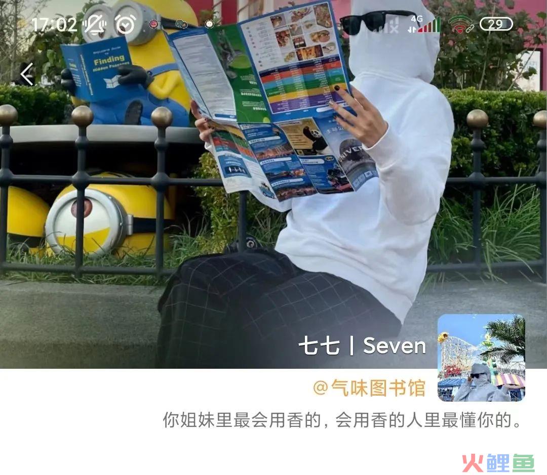从头像能看出是一个年轻时尚的女生在游乐场玩的场景,从头像来说比较符合品牌的人群画像,年轻的女性,而且没有过多的露出品牌,会有一种很贴近真人的感觉。而且这种不露脸的真人出镜,也不用担心用户过度的将七七这个角色带入到品牌中。