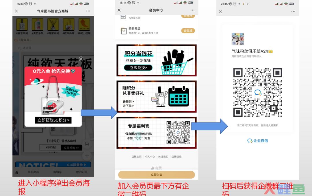 路径:进入小程序弹出加入会员海报→点击海报进入会员中心→最下方会员中心专属福利官二维码→会员群二维码。