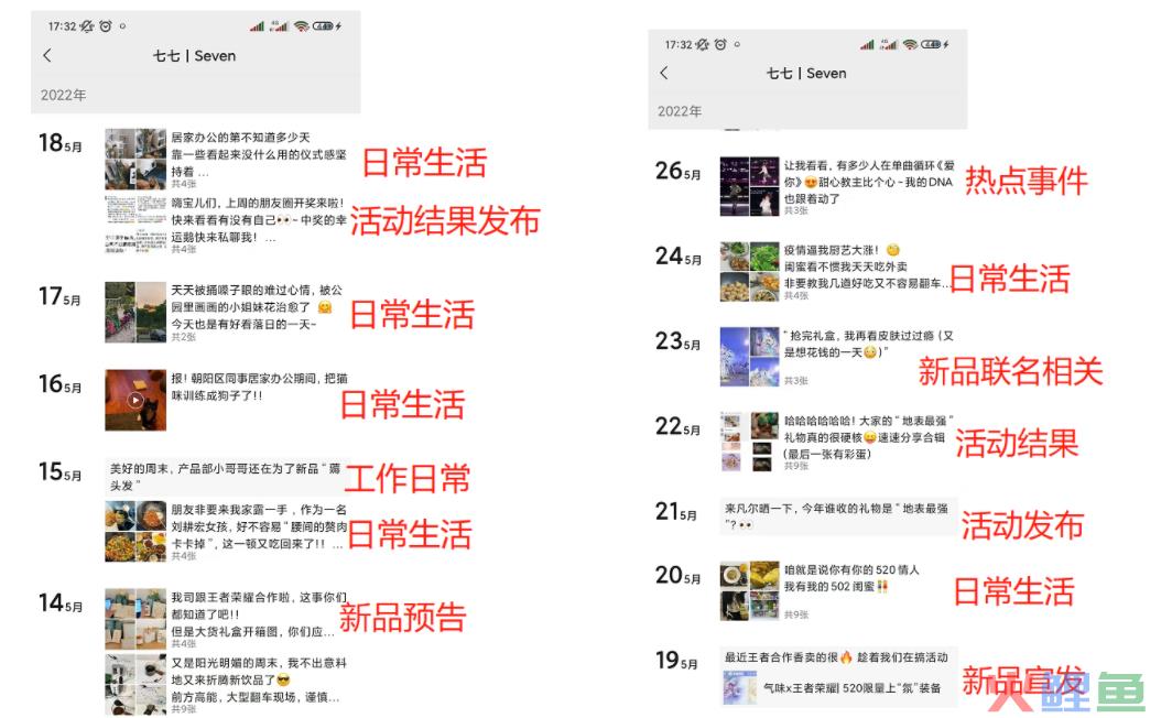 这样的运营节奏好处是非常接地气,有亲和力,真人感很强,大家一定不会觉得这是个机器人。但是日常生活发的过多,对用户来说缺少内容的增量,很容易被用户屏蔽。