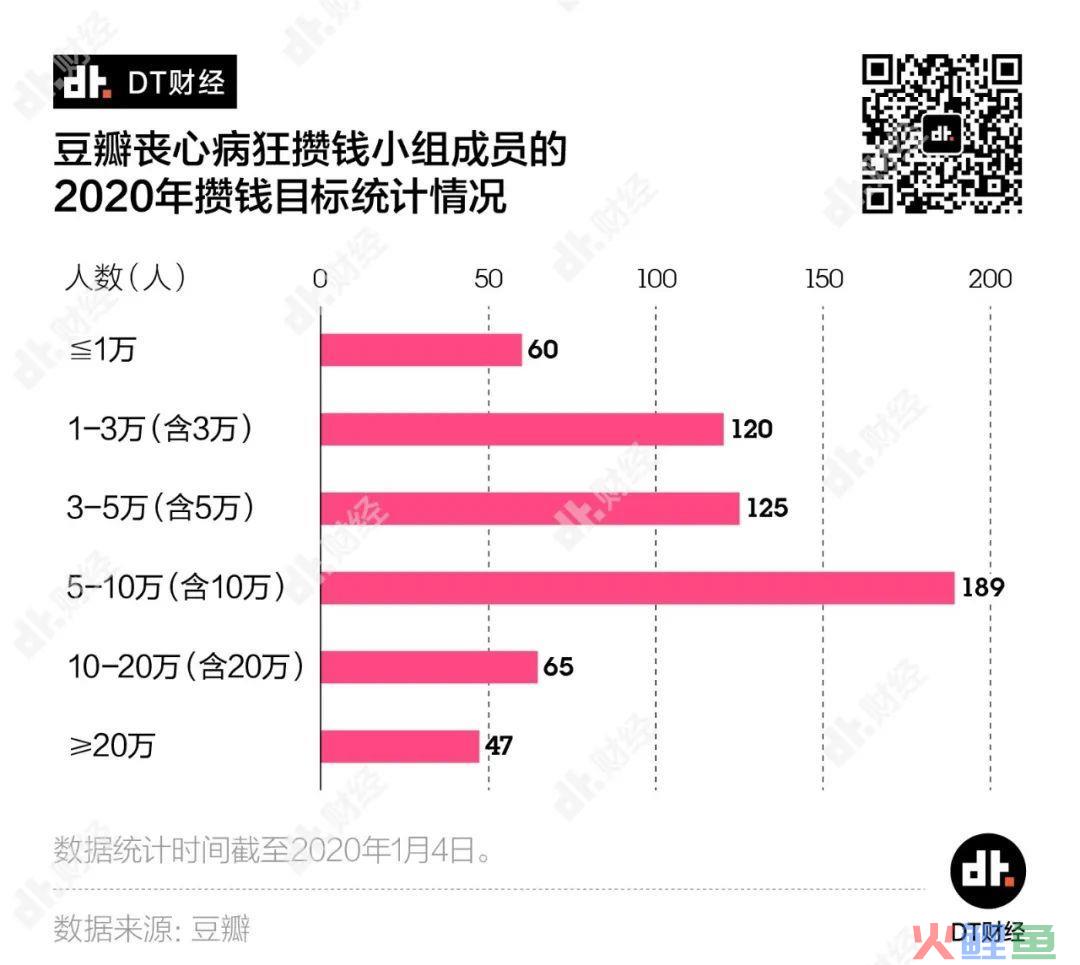 在这样共同鞭策、全员致富的氛围下,组内还发起了2020年攒钱目标的FLAG大会。作为存款还达不到小组人均水平的后进青年,DT君斗胆点进去瞅了瞅,顺便统计了下在野理财专家们2020年的攒钱目标。