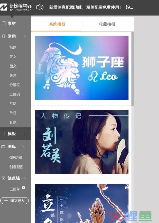 推荐理由:最大的特点就是免费,有很多实用亮眼的标题装饰之类,适合多种场景的模板(小清新、读书笔记、毕业季等)。最重要的是能够承受大于2M的GIF,在动图日益占据公众号趋势下,能够承载较大动图的编辑器是小编必备的,不然你怎么在内容上拉近和粉丝的距离呐~