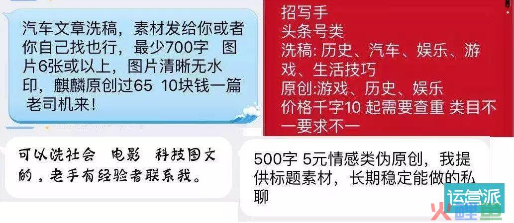 洗稿也分全职兼职。兼职写手主要为学生、宝妈和上班族,他们通过社交软件聚集,领取洗稿任务,价格通常为千字10元,很多人甚至不知道自己的稿件被发到了哪里。全职则是类似MCN的运作,公司开在成本较低的二三线城市,工资多为三四千元加提成,手脚利索的,月入可达上万元。