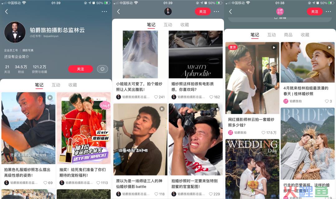 内容主要以旅拍作品案例,和摄影总监林云的趣味花絮为主;林云的搞笑视频互动量比较大,而旅拍成品笔记,作为展示公司拍摄的效果,两者结合起来。另外,更新作品数量也快2000条。
