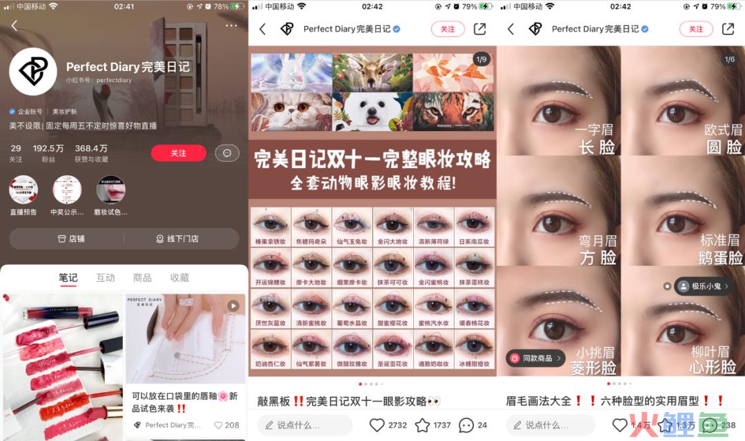 截止今天,192万粉丝,364.4万赞藏量。完美日记的笔记,可以说是把自己产品融入化妆教程,做到极致的小红书企业号;我们随便翻开一些笔记,都是把自己的产品作为教程,无论是眉笔、眼影盘、口红等等,