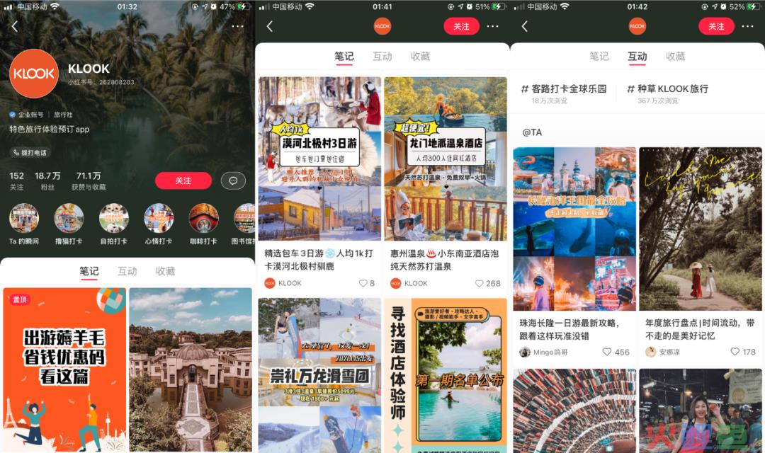 值得一提的是他们会召集旅游博主,帮助他们推广,详细我们可以看第三张图的互动界面,出现很多旅游博主的笔记;曝光量相对ok,最重要的旅游博主会在自己的笔记当中为他们引流,KLOOK还有一个小号,这个号专门做引流。