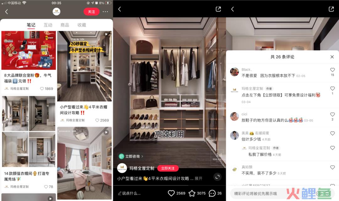 《20秒搞定,小户型衣帽间设计》,这是一篇短视频笔记,20秒快速的用3D效果来讲完小户型衣帽间设计,真的很有感觉;获得5000多互动量,这种快速的视频笔记,收藏率比较高,还是因为记不住。看完以后,会多看几遍