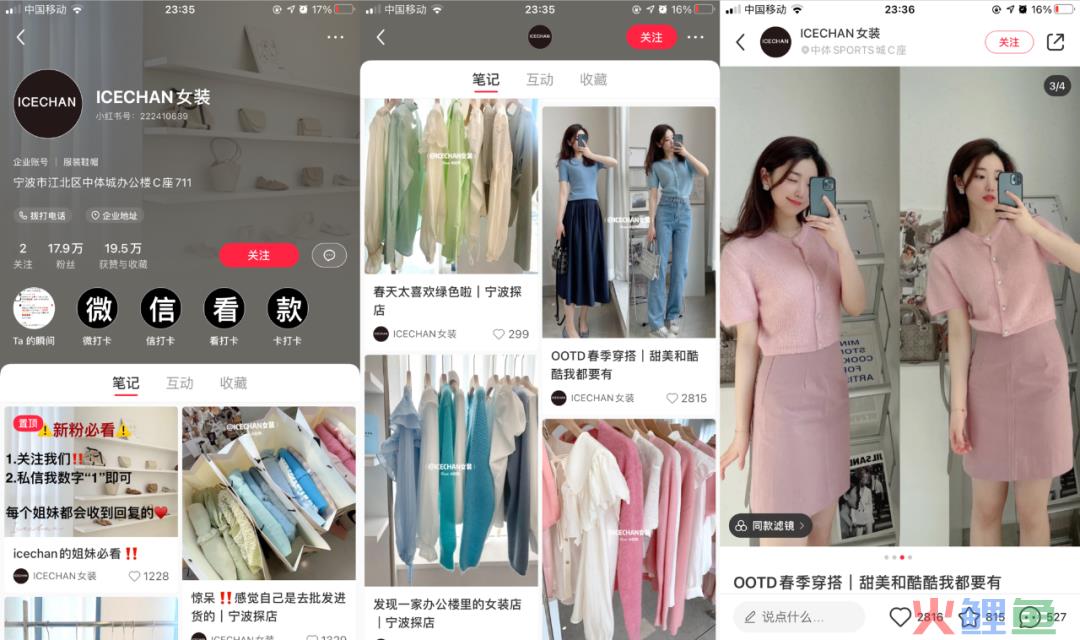 笔记是视频形式,对于服装行业较新颖,封面图加上主题定位,让人清晰可见,视频第一帧采用人声概括总体内容,后面则由模特上身展示服装;配乐、剪辑形式偏向抖音风格,服装变换展示形式较新颖。