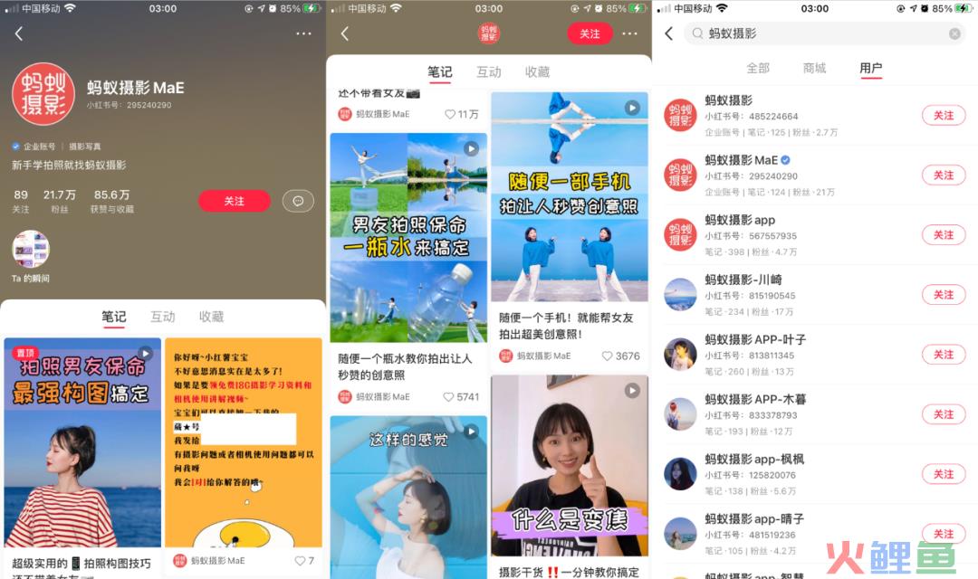 蚂蚁摄影主要是引流到微信的摄影课堂,也有蚂蚁摄影app。布局的账号比较多,有些是个人号;笔记内容都是视频教程,包括构图和拍摄手法。他们的引流比较直接,在最新笔记图片谐音写微信号码,很猛,也很野。