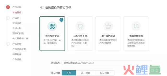 第一步 新广告计划,系统会让你选择营销目标,各位根据公司推广产品进行选择,笔者是从事招商加盟的,选择是“销售线索收集”。