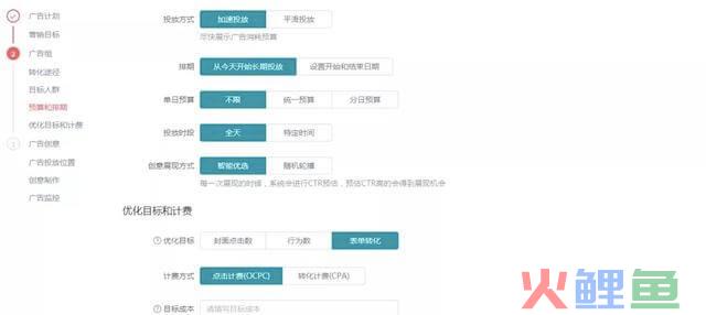优化目标和计费:根据个人行业和预算去设置投放的方式,投放的时间段,目标出价。目前快手有按封面点击数(曝光),行为数(点击),表单转化(目标转化出价),新户和第一阶段是没有表单转化为优化目标的,需要满足以下条件才能自动激活。