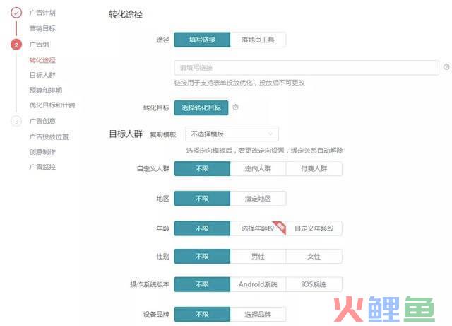 转化路径:就是选择你的推广页面,可以用外链,也可以用自建站(魔力建站)目标人群即基础定向,基础定向主要包括年龄、地域、性别、学历等。