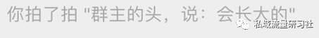 我们可以将这个功能配合着表情包一起,在社群“造势”。我们先在群里发一个表情包,然后再去拍一下发言的群友。或者群主可以吧自己的备注改成为:“皮球”、“老虎屁股”....然后再让群友“拍拍”他。群友把效果拍出来后,大家都觉得有趣,就会参与进来。同时这样的行为也能促进群内UGC和群有之间的互动,一旦有人开始起头,群里的人都开始模仿,于是在群里我还看到了这些语句: