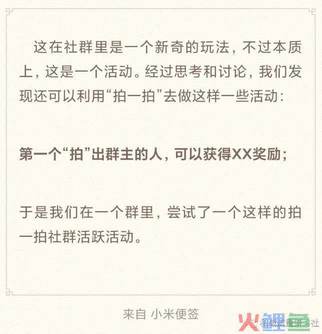 很快,许多群聊里都在不断地被“拍一拍”刷屏,甚至连曾经的死群都活跃起来了。不得不说,微信出的这个小小的功能,居然会在微信群里起到了强大的促活作用。如果我们能够好好利用它,是不是可以快速提升社群活跃度呢?抱着这个疑问,我们在几十个群里观察了一段时间,总结了这些促活的方法:
