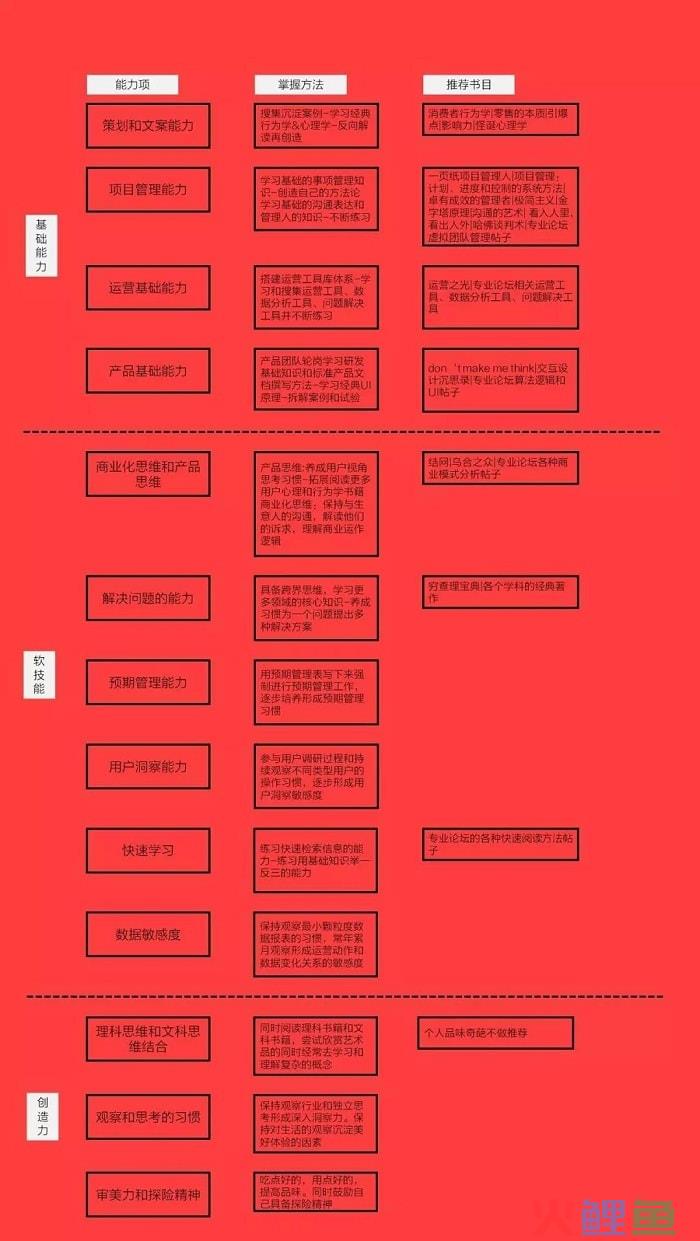 这个能力的提升要求我们不要局限在自己的领域里去学习技能,要更多的打开自己的视野,学习其他行业,其他领域的知识体系,因为很多问题的本质归根结底是一致的,综合学科的知识能够帮助你形成通用知识和能力,这就是所谓的跨界知识。