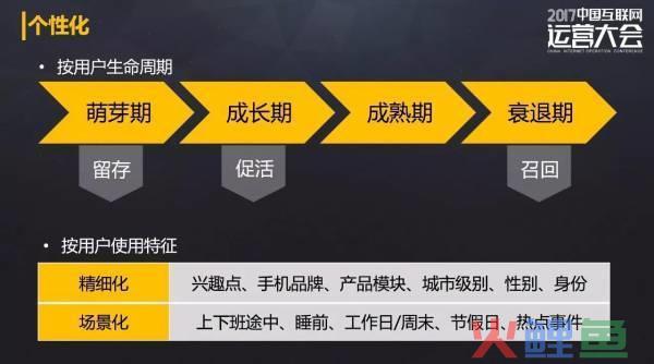 再说个性化,是指根据用户个体的不同情况,做针对性的运营。用户的情况可以按上图,分为生命周期和特征两种。