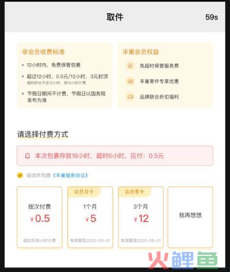 此前,深圳市丰巢科技有限公司(简称“丰巢科技”)宣布,自4月30日起,丰巢将对滞留快件的非会员用户在超时12小时后收费0.5元/12小时,3元封顶,法定节假日不计费。同步推出的还有会员服务,月卡会员5元/月,季卡会员12元/季,有效期内不限保管次数,每件快件可享受7天存放。
