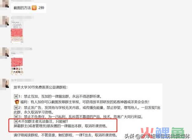 每个进群的人,必须加群主的微信号,在群规中,有一句话:屏蔽群主(或者管理员)朋友圈的一律踢出本群,取消听课资格,这样做的目的就是为了避免同行在我们好不容易建立起来的流量池中翘客户