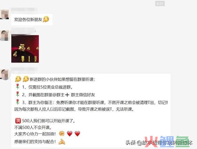 请完成拉5个美业总裁进群,截图发到群里并➕ 群主微信备注:免费听课的亲抓紧时间完成哦!不然会清理出群哦!这30节课程,每一节都是根据美业总裁的需求制订的,仅需拉5位美业好友就可以免费学习,超值哦!赶快行动起来,达成目标哦!500人满了就可以开课了,大家加油哦!备注:上面这段话要不断的重复,造成紧迫感